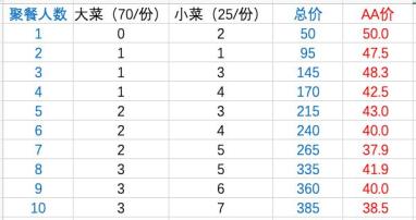 聚餐花销有一个重要因素,那就是A钱的多少,这是由人数决定的。整体来说,人越多A的钱也就越少。但也不一定。拿点菜类的聚餐来说,点菜分为大菜和小菜,大菜小菜价格悬殊。一般是每多3个人就多点一份大菜,但多两个人时也会点大菜。这是A钱的关键。假设大菜70块,小菜25块,根据我多年的点菜经验,可能出现如下组合