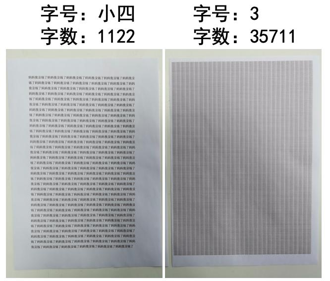 字号3以下打印出来糊的一批,还是算了如果用字号3打印,再加上极致的行间距和页边距,一页足足能打35711个字!大概是默认格式的四号打一页字数的32倍,也就是能少打31页,直接省下3块1毛钱啊!