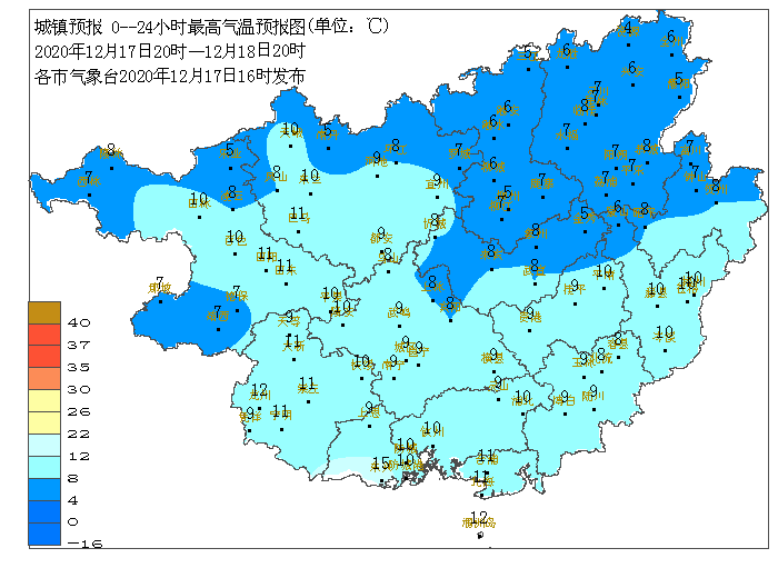 广西气象台预计,随着一股干燥的冷空气补充影响,气温仍会处在一个持续偏低的水平,但天空状况转好。白天雨水停歇,高寒山区及桂北局部仍有冰冻或道路结冰。未来几天,气温回升得缓慢,白天有太阳照晒气温高一些,未来几天,全区大部最高气温逐渐回升到10℃以上,21日大部最高气温都将回升至15~18℃。