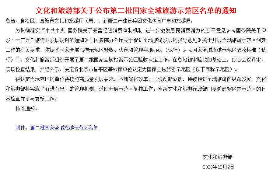 日前,国家文化和旅游部发布《关于公布第二批国家全域旅游示范区名单的通知》,决定将北京市昌平区等97家单位认定为国家全域旅游示范区。其中,广东省三家:梅州市梅县区、韶关市仁化县、深圳市盐田区,加上第一批的广州市番禺区、江门市台山市,全省现有国家全域旅游示范区共5家。