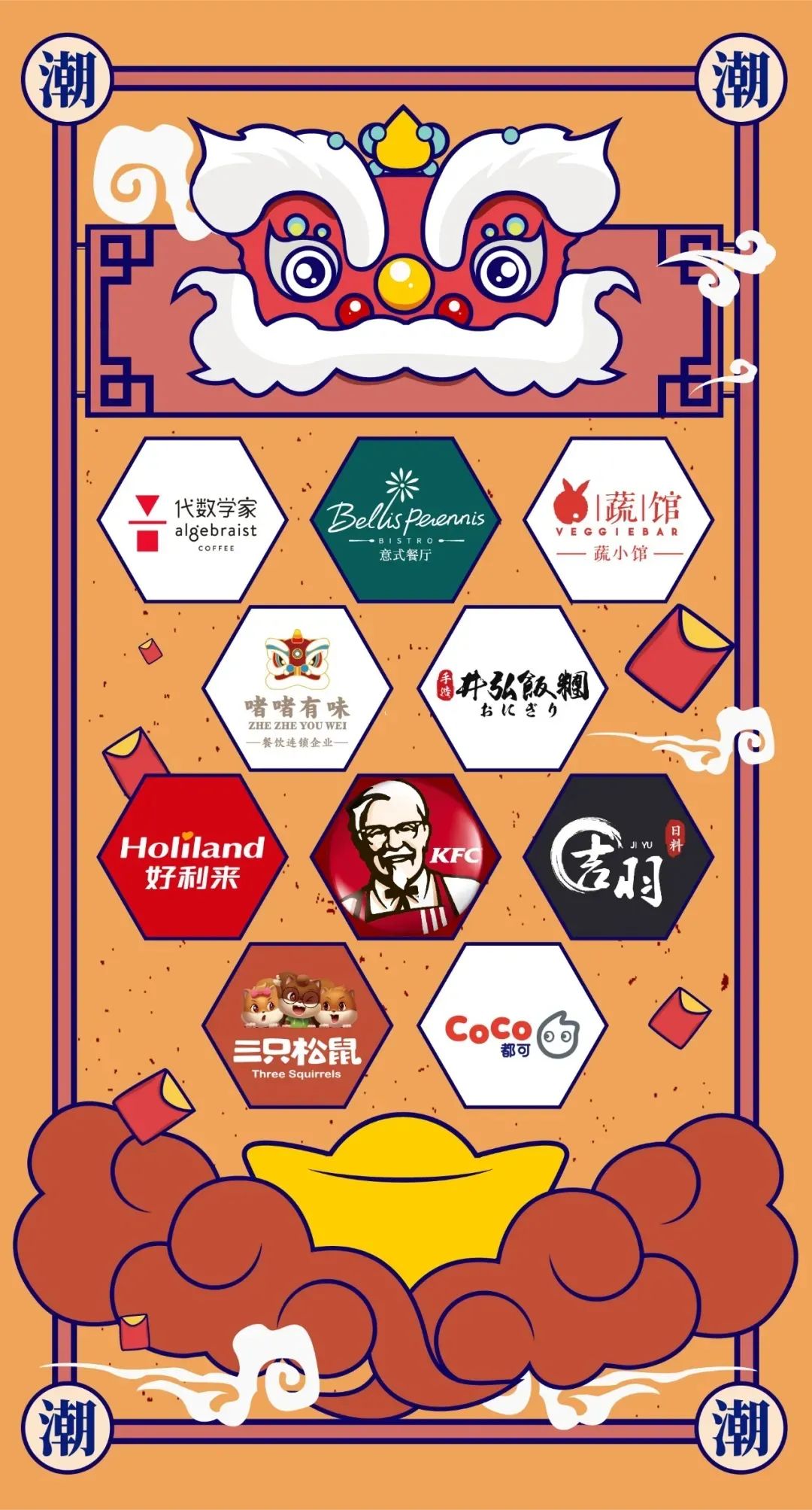 餐饮类:代数学家咖啡、CoCo都可、吉羽日式料理、兔蔬馆、小雏菊意式餐厅、鑫震源、啫啫有味、井弘饭团……