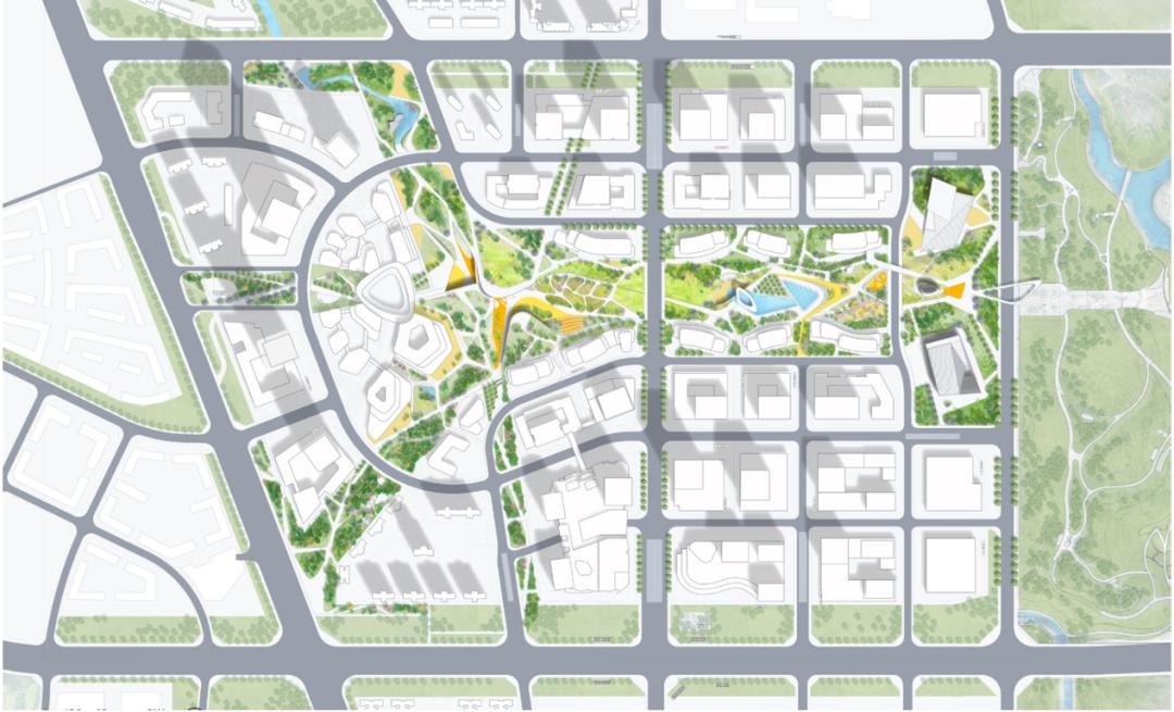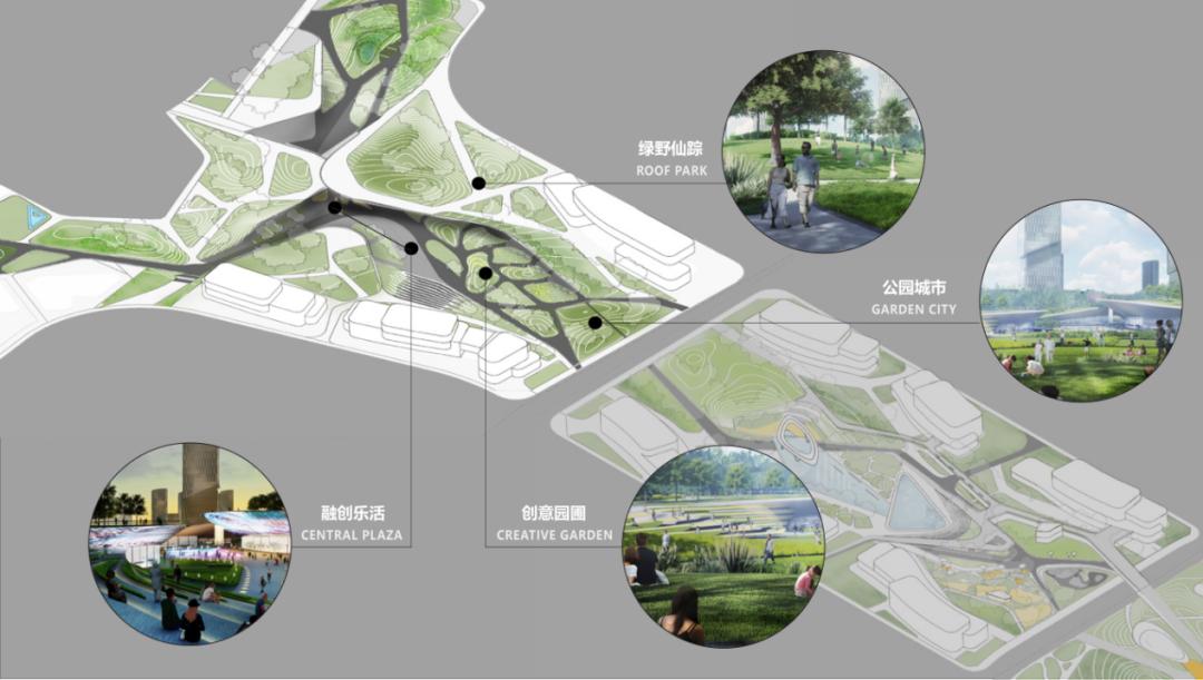 ATLAS从城市、尺度、生态三个维度入手,认为城市尺度把握适宜步行,倡导绿色出行,交通体系连接地上地下,高能高效,服务大量人口的出行和疏散;生态上应该传承土地文脉及人文历史,尊重原有人文地貌,体现当地人文特点,构建均好的生态绿色框架,调配开放空间比例,增加绿色基底。从而提出“大树下,24Hx7D的快乐公园城市”的设计理念,并以大树为设计核心亮点,将总部商务区的中心建筑成为地标“智慧树”,在这棵大树下人们交流互动形成新的“种子”生长,成为城市发展的新动力,进一步推进城市的成长发展。