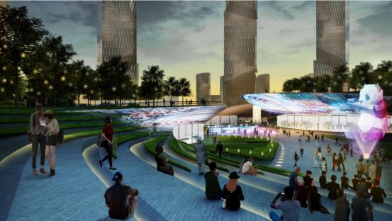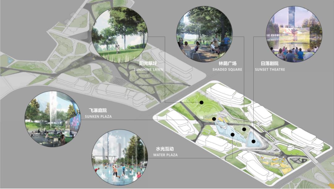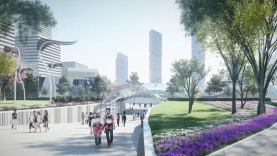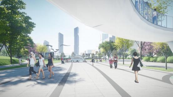▌中央广场 效果图ATLAS的方案中将人字绿廊区域由东至西形成门户公园、商务公园、中央广场、健康公园、生态公园、城市露台6大板块。在各板块中细分形成城市走廊、健康公园、休闲公园、露台互动区、智慧树、城市客厅台阶、阳光草坪、商务谷、艺术天桥等标志性景点。