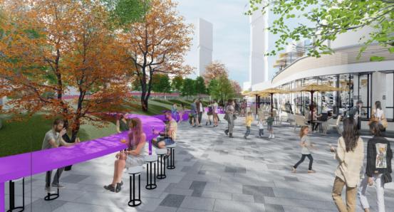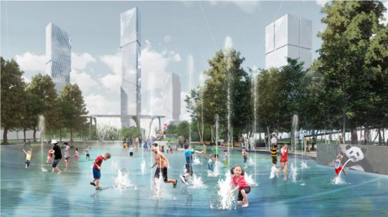 SWA遵循VOD的设计概念与策略,基于成都年轻人的多元化生活方式,打破传统的功能分区理念,对公园的不同空间赋予中心广场、阳光草坪、室外剧场、滑板公园、接物广场、口袋公园等不同属性,消融传统的空间边界,并进行有机活力重组,从而形成以商圈绿轴区、中心广场区、城市客厅区、文化潮玩区、生态桥五大节点功能区串连的活力中轴,未来可以实现休闲、服务、活力、生态、商业、汇景、共享、娱乐、体验、互联等功能,激发和创造空间的活力。