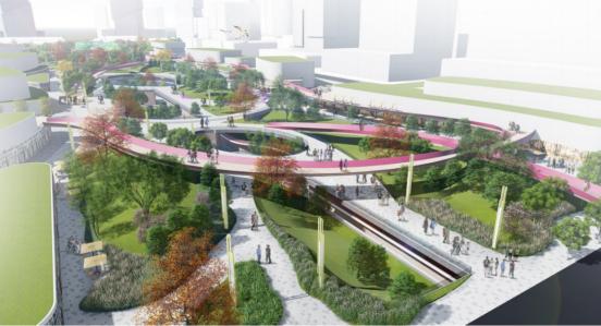 ▌最城市十景 示意图其中,超链公园有三大核心亮点,在生态上,以景观自然采光坡道的形式打开隧道空间,引进自然光、增加空气对流、并加强空间联动;消融空间边界,将绿化渗透到建筑边缘,以植物穿插,设置森林餐桌等设施,增强空间互动。