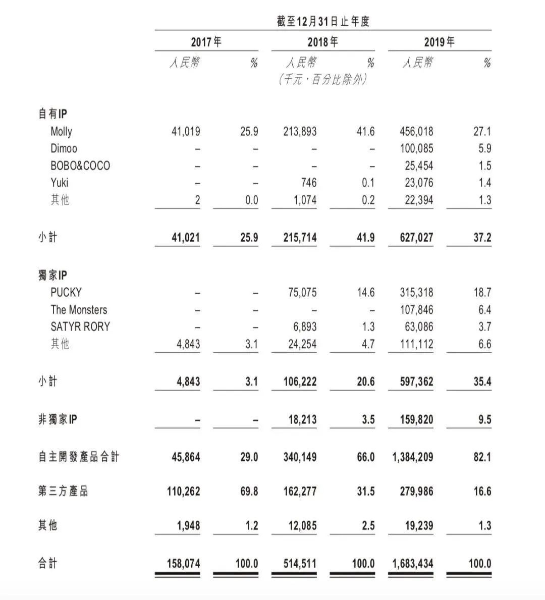 在这“全民娱乐”的时代,IP对于一家创意经济企业的价值是不言而喻的。得IP者得天下,也不再只是标语口号。在泡泡玛特400页的招股书里,IP这个词共出现了376次。泡泡玛特强调IP是其业务核心,目前其运营有85个IP,其中12个是自有IP,如 Molly、Dimoo 等;还有22个独家 IP ,如 Pucky 等;此外,还有51个非独家 IP 。