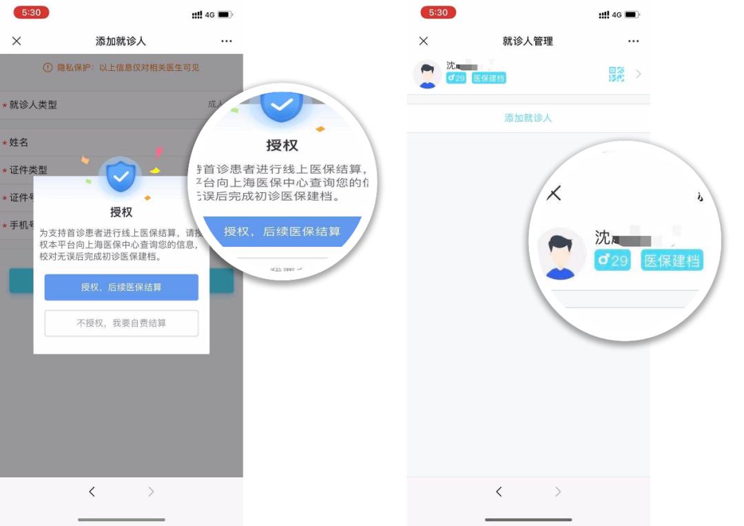 完善预约信息。首次关注我院微信公众号的就诊人,在预约之前还需请您完善个人信息,具体方法是在“就诊人管理”中,填写姓名、证件类型、证件号及手机号码,如您持有本市医保卡,在填写完毕后,授权系统进行医保结算核验,验证通过后您就可以线上使用医保卡就医。为方便老人和小孩就医,您还可以将直系亲属添加到就诊人中,这样就可以利用自己的账号替他们完成就诊预约及付费功能。