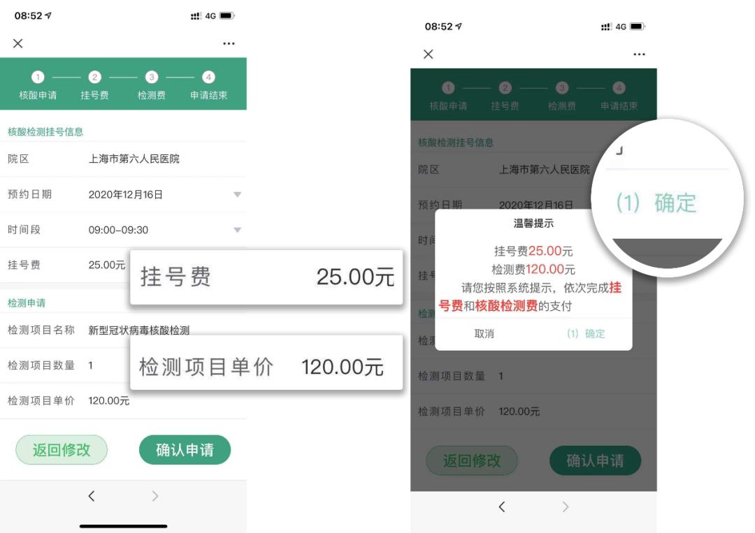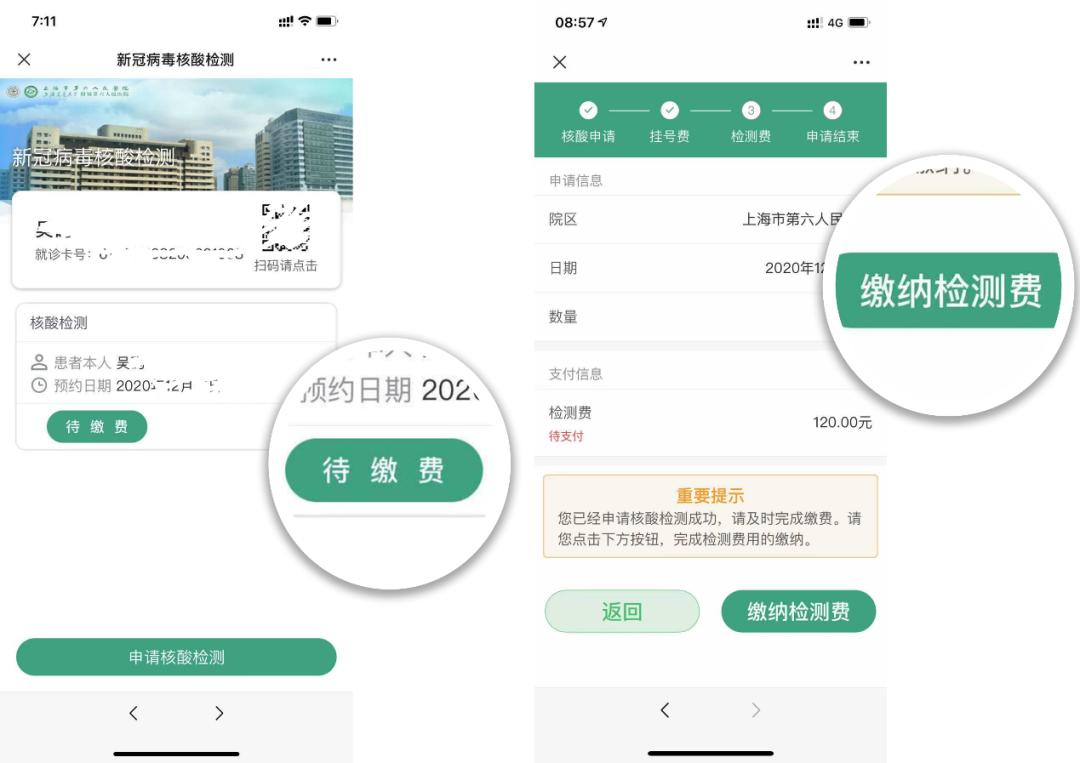 PART-3支付费用。核酸检测需分两笔分别支付25元挂号费及120元核酸检测费,检测费用在核酸检测当日缴费,您可使用本市医保卡通过医保结算或自费检测。缴费后,页面上方的二维码,即可至核酸检测窗口完成采样。