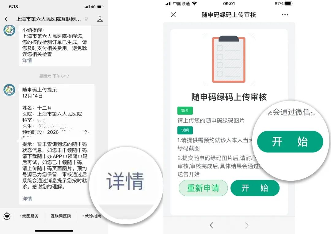 温馨提示1为确保您到院就诊期间的安全,我院会从上海市大数据中心获取就诊患者的流调信息。如因各种原因未能从大数据中心获取随申码信息并跳转支付页面时,请在相关消息推送后点击“详情”后手动上传随申码,经人工审核后,请您重新进入“核酸检测预约”完成缴费流程。工作时间审核最长不超过60分钟,非工作时间不超过24小时,您所预约的核酸检测时间段已为您预留,请您耐心等待。
