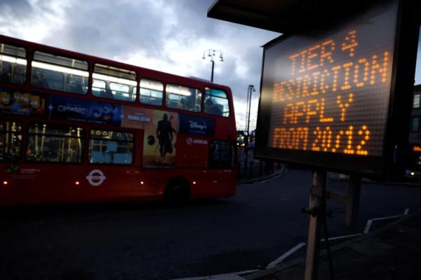 12月20日,在英国伦敦,一辆巴士经过显示“12月20日起实施新冠疫情防控级别第四级”字样的电子屏。新华社 图据英格兰公共卫生局介绍,这一变异病毒被命名为“VUI-202012/01”。目前在英国一些疫情较严重的地区,能够观察到较大数量的这种变异病毒感染的病例。