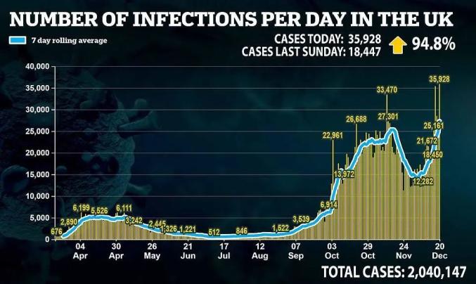 自11月下旬以来,英国新增病例再次激增 图据《每日邮报》英国新冠病毒变异