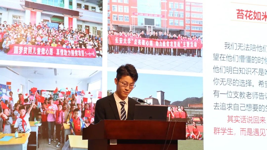 沈文硕展示了我校研究生支教团历年来的工作成绩,讲述涌现的感人事迹,展现我校青年学生为脱贫攻坚事业贡献的长大力量。