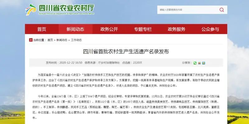 ↑四川省农业农村厅官网截图据了解,今年以来,全省134个县(市、区)上报了504个遗产项目,经会议审核、专家评审和反复核查,12月21日,农业农村厅第20次厅务会议审议通过《四川省农村生产生活遗产名录(第一批)》(名单附后),共有112个县(市、区)的165个项目入选。