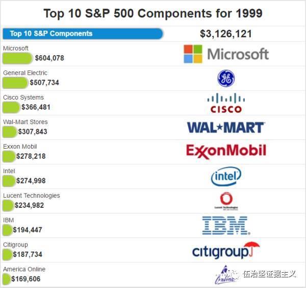 将时间拉到20年前,2000年3月10日,美国纳斯达克指数达到了当时的历史新高5,048点,整个世界为互联网带来的科技革命感到疯狂。据伍治坚报道:以1999年年底的数据为例,当时美国市值规模最大的10家公司中,有6家属于科技类公司,其中微软在1999年的市值超过6,000亿美元。