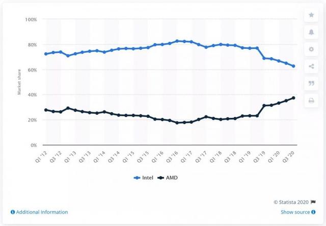 今年全球芯片行业也迎来巨大变动,那就是英特尔的落幕老牌巨头英特尔面临英伟达与AMD双面夹击。根据 Statista 的分销统计,AMD的处理器市场份额在第三季度达到了37.3%。这是自调查期开始(2012年开始)以来的最高水平。英特尔的市场份额为62.6%,是同期的最低水平。
