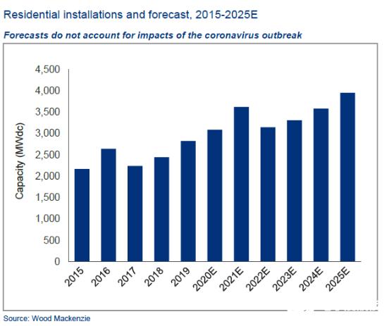 根据Wood Mackenzie预测,美国2020-2025年的户用光伏会迎来较大幅度增长,这主要是消费差异所致,美国高端消费者似乎更喜欢郊区的独栋住宅,而非户用光伏的发展则会相对平稳一些。