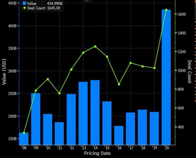 今年美股虽说历经熔断之后迎来大跌,但在美联储一连串的救市操作下,美股上演逆势反弹的戏码。在美股创新高背后,今年上市的不少新公司也为美股募集到不少资金。根据美股研究社的整理:今年美股累计筹集资金4350亿美元,远超2014年创下的历史记录——2790亿美元。其中通过传统IPO方式上市的融资规模达1000亿美元,也刷新了历史记录。