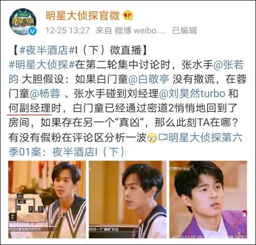 由芒果TV制作的综艺节目《明星大侦探》第六季第一案《夜半酒店》分为上下两集播出: