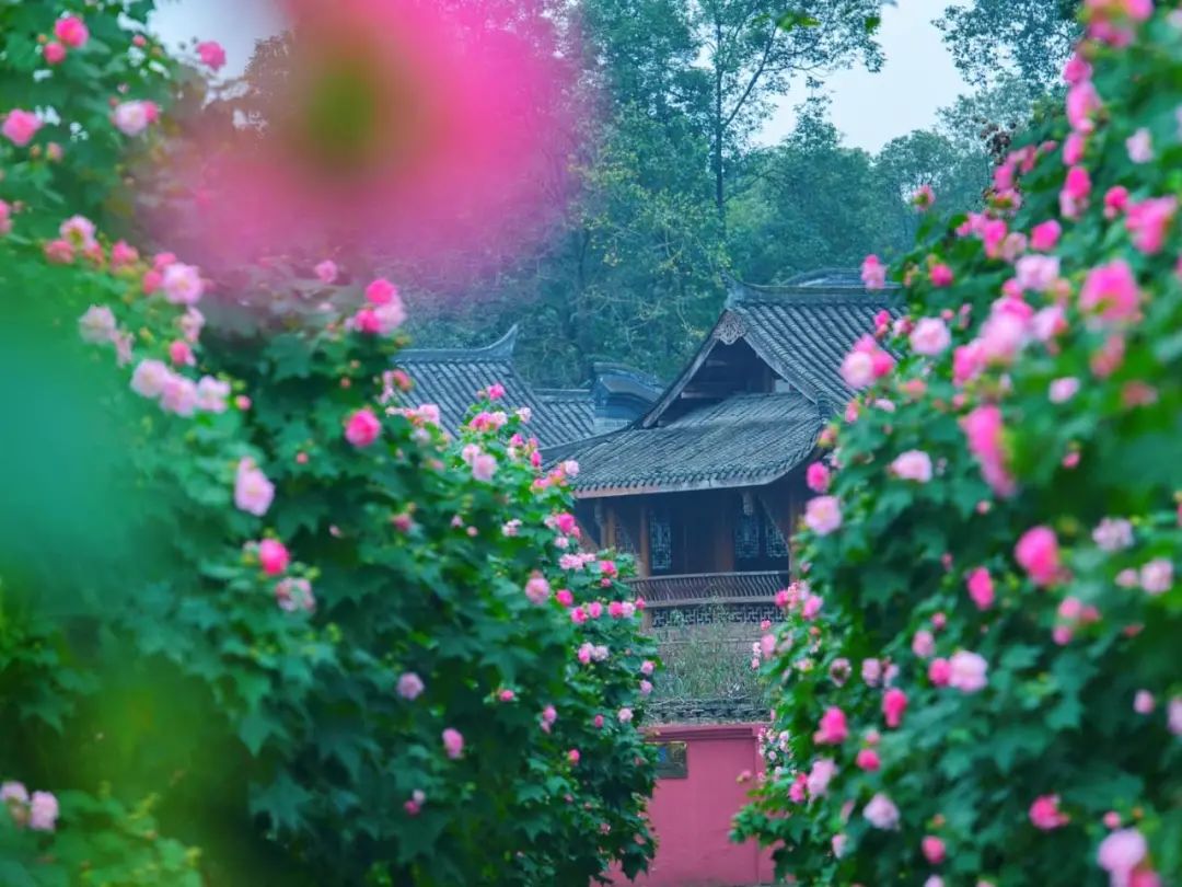 ▲青龙湖湿地公园,明蜀王陵外的芙蓉花浣花梅花、碧鸡海棠、天彭牡丹