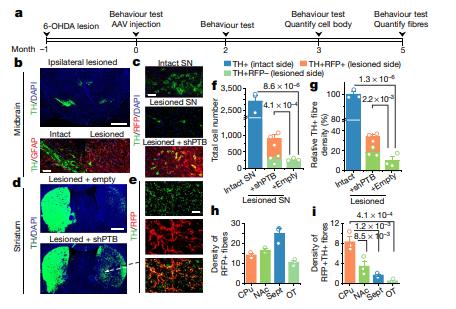 研究人员将PTB反义寡核苷酸直接应用于小鼠的中脑,中脑负责调节运动控制和奖励行为,而在帕金森病中,中脑通常会失去产生多巴胺的神经元。对照组小鼠接受空病毒或不相关反义序列的模拟治疗。