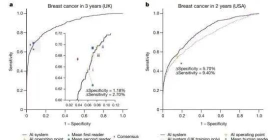研究人员发现假阳性率降低了5.7%和1.2%(美国和英国),假阴性率降低了9.4%和2.7%。研究人员提供了该系统从英国推广到美国的证据。在对六位放射科医生的独立研究中,AI系统的表现优于所有人类医学读者:人工智能系统在受试者工作特性曲线下的面积(AUC-ROC)比一般影像学医师的AUC-ROC要大,绝对幅度达11.5%。研究人员进行了模拟,其中AI系统参与了在英国使用的双重阅读程序,结果发现AI系统保持了不逊色的性能,并将阅片医师的工作量减少了88%。
