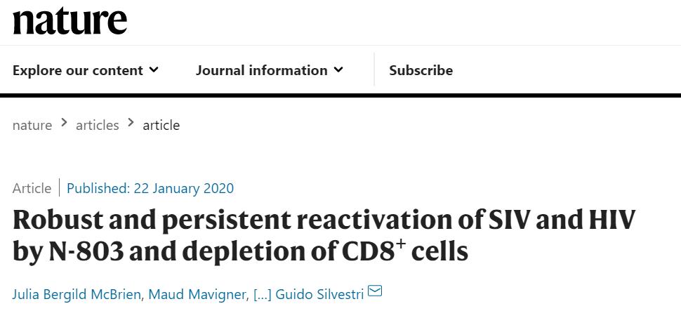 Robust and persistent reactivation of SIV andHIV by N-803 and depletion of CD8+ cells. Nature. doi:10.1038/s41586-020-1946-0