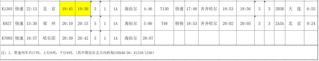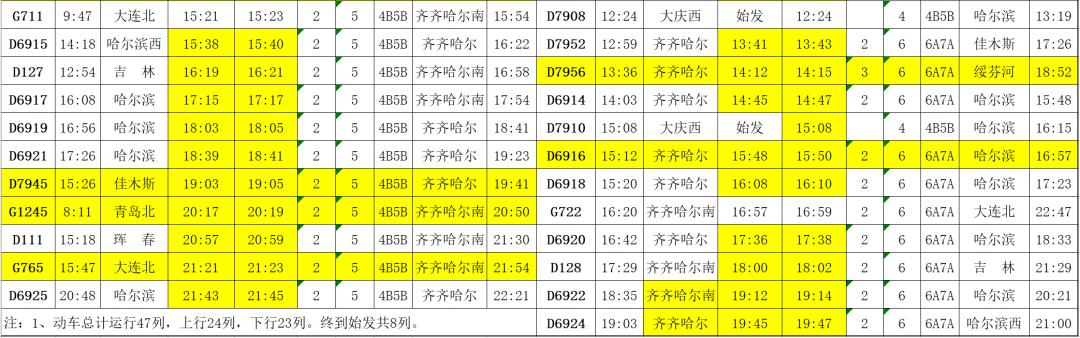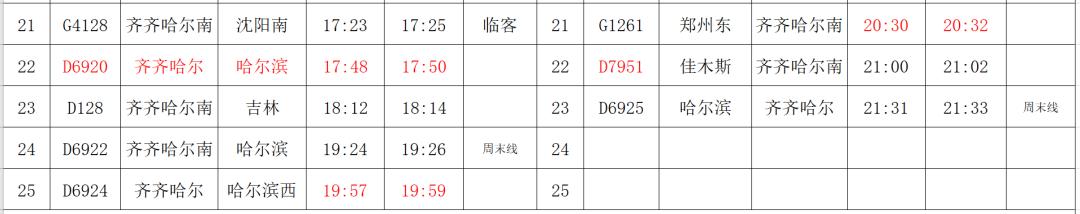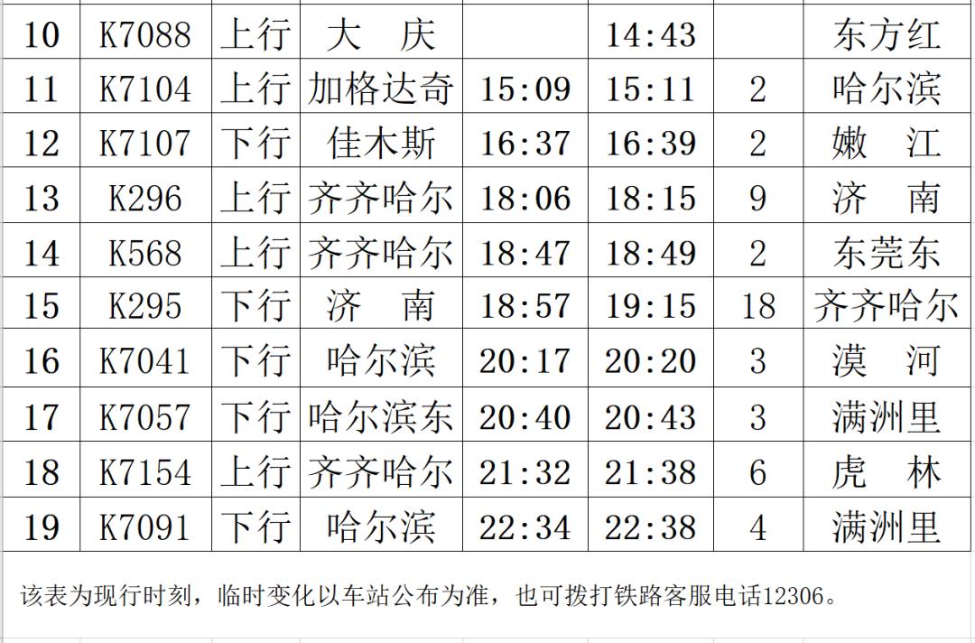 (1)K7057/7058次列车由原来的哈尔滨西—满洲里,调整为哈尔滨东—满洲里间运行。