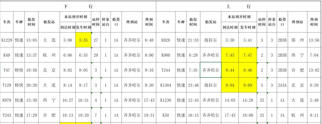 (3)K7042次漠河—哈尔滨,由原时刻9:50/9:58调整为7:37/7:39。