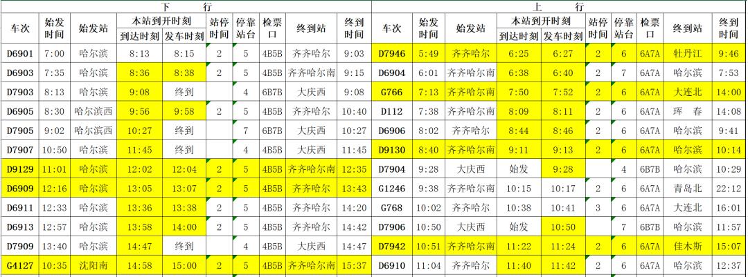 (4)K7103次哈尔滨—加格达奇,由原时刻14:56/14:47调整为11:56/12:00。
