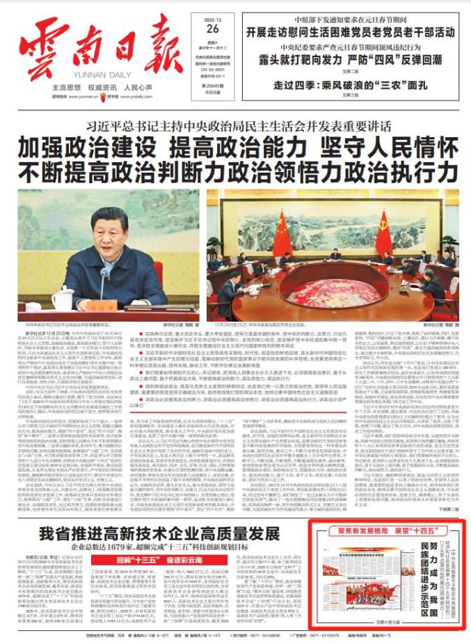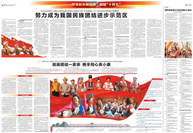 12月26日,《云南日报》头版重要位置,以及6—7版“聚焦新发展格局 展望‘十四五’”特刊,用了一个专版刊发专题文章《努力成为我国民族团结进步示范区》《民族团结一家亲 携手同心奔小康》,聚焦云南“十三五”期间建设我国民族团结进步示范区的生动实践,并解读了《中共云南省委关于制定云南省国民经济和社会发展第十四个五年规划和二〇三五年远景目标的建议》中关于努力建成我国民族团结进步示范区的行动纲领。