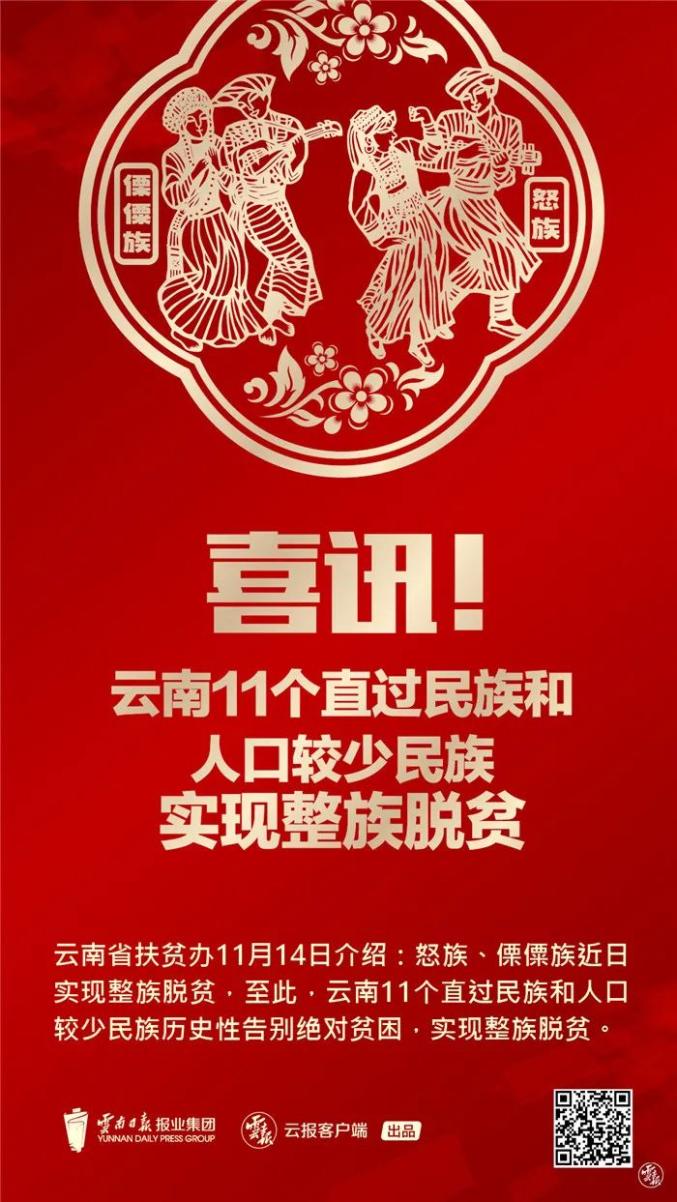 2020年11月14日,云南省扶贫办发布消息:怒族、傈僳族近日实现整族脱贫。至此,云南独龙族、德昂族、基诺族、怒族、布朗族、景颇族、傈僳族、拉祜族、佤族等11个“直过民族”和人口较少民族历史性告别绝对贫困,实现整族脱贫。这是一份让人喜出望外的成绩单——