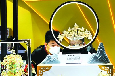 观众在第十九届中国国际玩具及教育设备展览会上观看3D金属拼图展品。新华社发