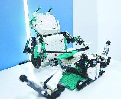 第三届进博会乐高展台的机器人在演奏“架子鼓”。新华社发