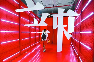 观众在湖南省长沙市“字在其中”汉字国潮艺术展展区参观。新华社发