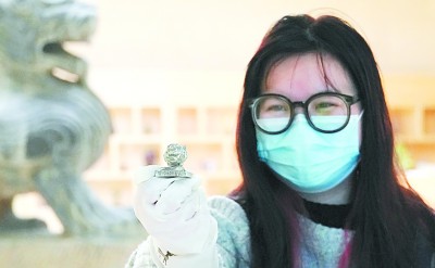 工作人员展示从“考古盲盒”中挖出的虎首印章文创产品。新华社发