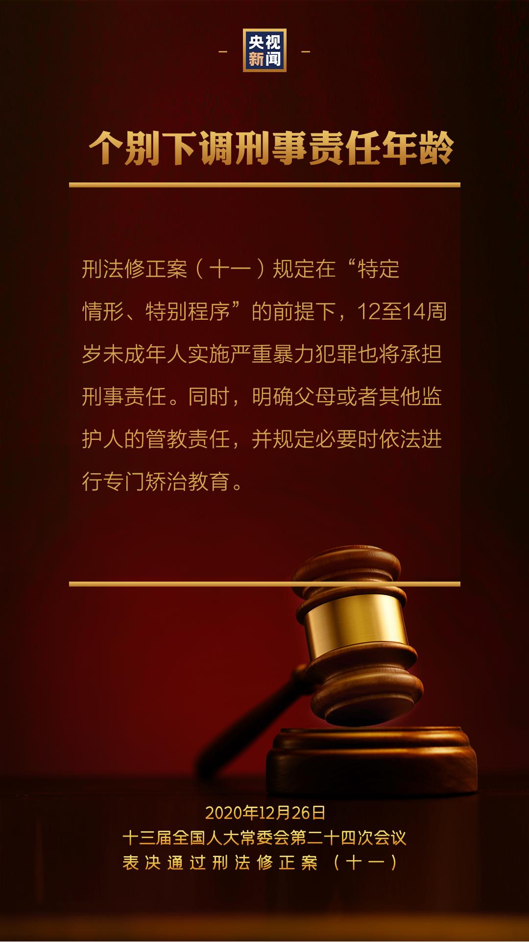 刑法修正案(十一)规定在“特定情形、特别程序”的前提下,12至14周岁未成年人实施严重暴力犯罪也将承担刑事责任。同时,明确父母或者其他监护人的管教责任,并规定必要时依法进行专门矫治教育。