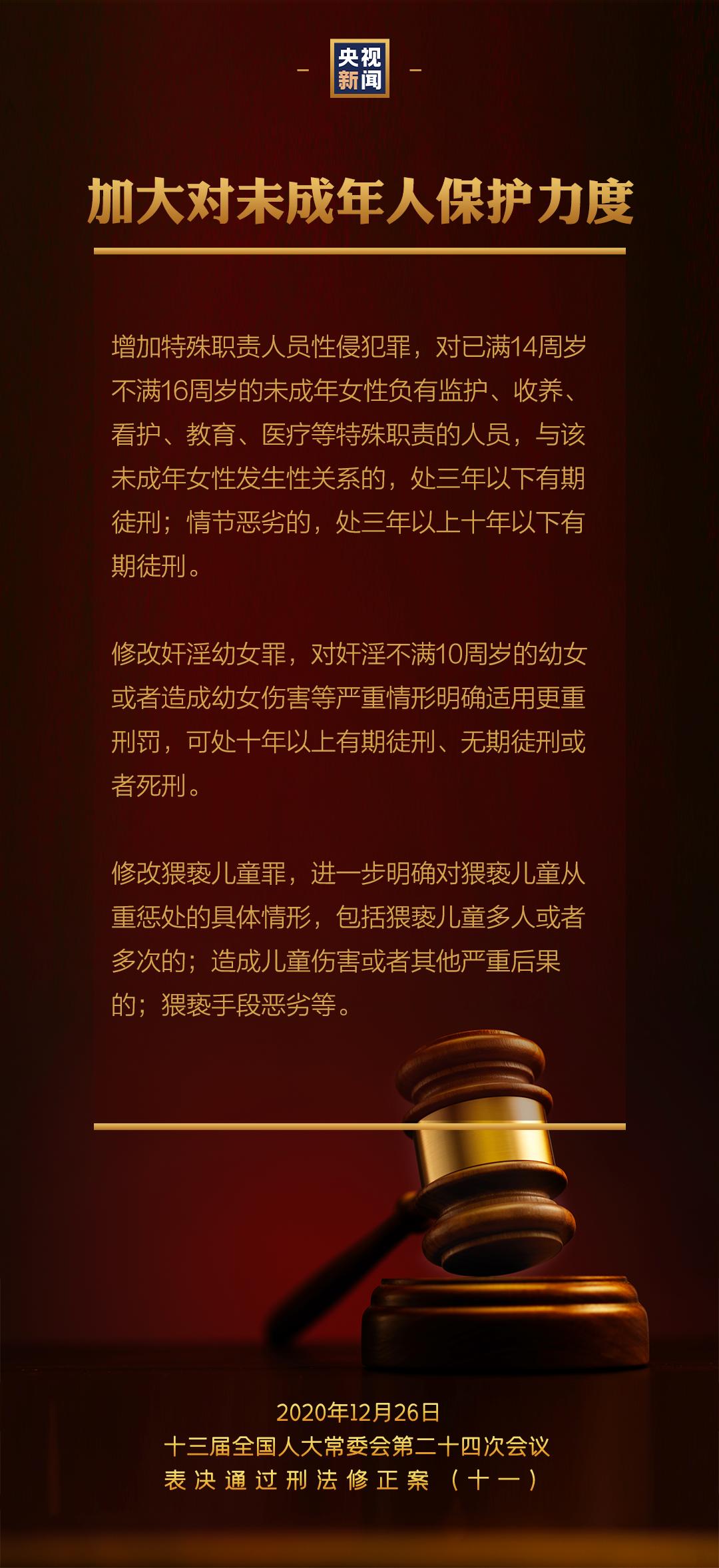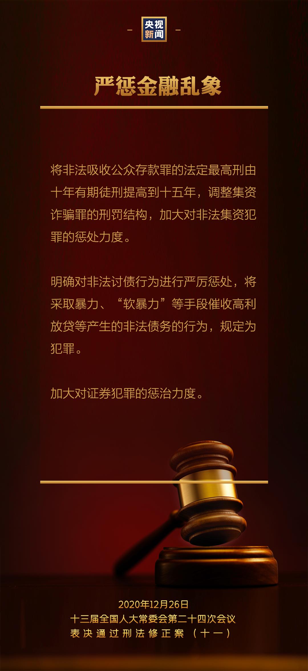 导读26日,十三届全国人大常委会第二十四次会议表决通过刑法修正案(十一),将于2021年3月1日起施行。刑法修正案(十一)新增条文13条,修改条文34条,其中新增及修改了哪些罪名?来看全文和修订要点��