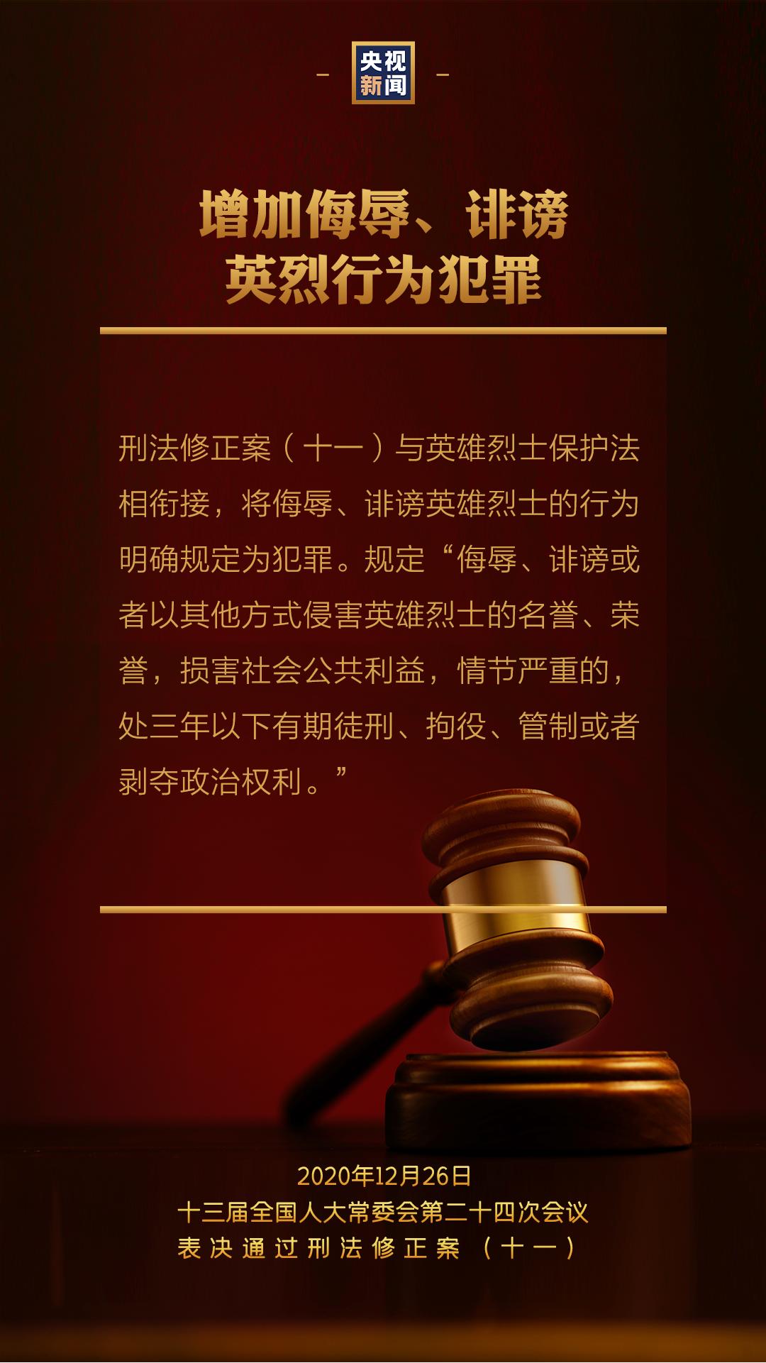 刑法修正案(十一)与英雄烈士保护法相衔接,将侮辱、诽谤英雄烈士的行为明确规定为犯罪。规定“侮辱、诽谤或者以其他方式侵害英雄烈士的名誉、荣誉,损害社会公共利益,情节严重的,处三年以下有期徒刑、拘役、管制或者剥夺政治权利。”