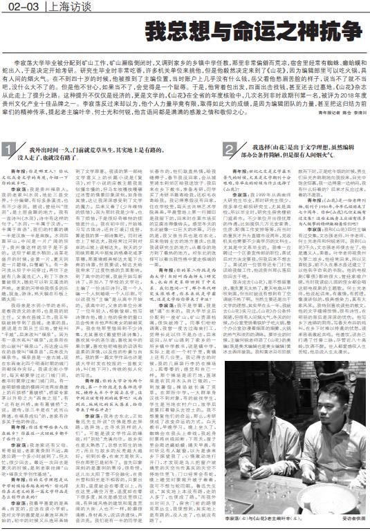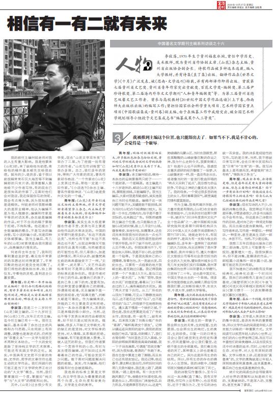 于是,他背着包出发,四面出击找钱,甚至还去过墓地。《山花》杂志从此走上了提升之路。这种提升不仅仅是经济的,更是文学的,《山花》在全省的年度核验中,几次名列非时政期刊第一名,被评为2018年度贵州文化产业十佳品牌之一,被中国新闻出版研究院和龙源期刊网等机构评为2019中国人文大众数字阅读影响力期刊TOP100。李寂荡反过来却以为,他个人力量毕竟有限,取得如此大的成绩,是因为编辑团队的力量,甚至把这归结为前辈们的精神传承,提起老主编叶辛、何士光和何锐,他言语间都是满满的感激之情和敬仰之心。