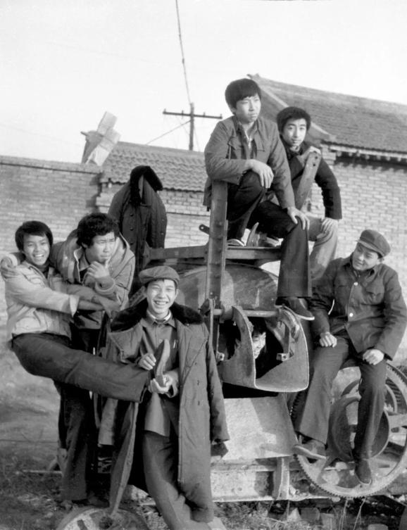 1986年冬,陕西渭南地区华阴桃下镇,第十冶金建设公司子弟学校高二(1)班男同学在一所废弃的水库边上的混凝土搅拌机上合影。