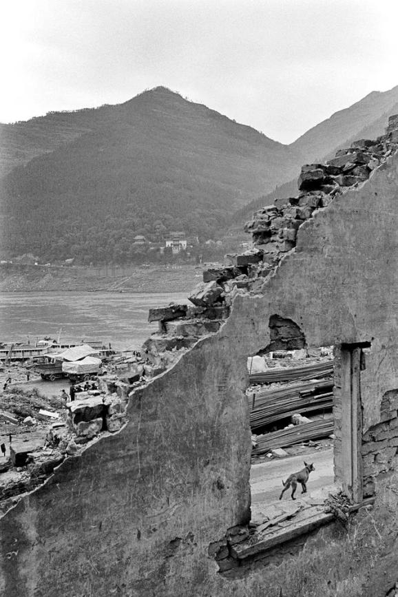 2002年5月6日,重庆云阳旧城,悠闲的野狗在残破的窗口里闪现,远处是即将搬迁的张飞庙。