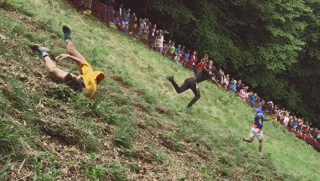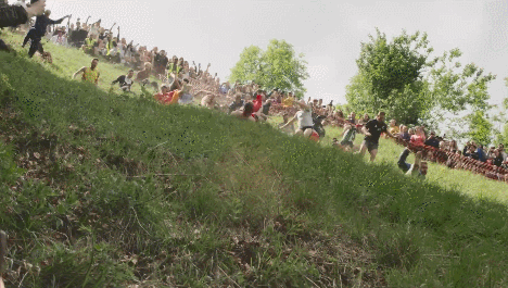 第一个冲过山底终点线的就是获胜者。他将被授予「冠军奶酪追逐者」桂冠。