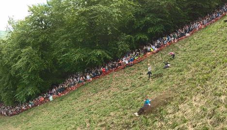 随着一声口令发出,包裹得严严实实的奶酪飞速滚下山坡。
