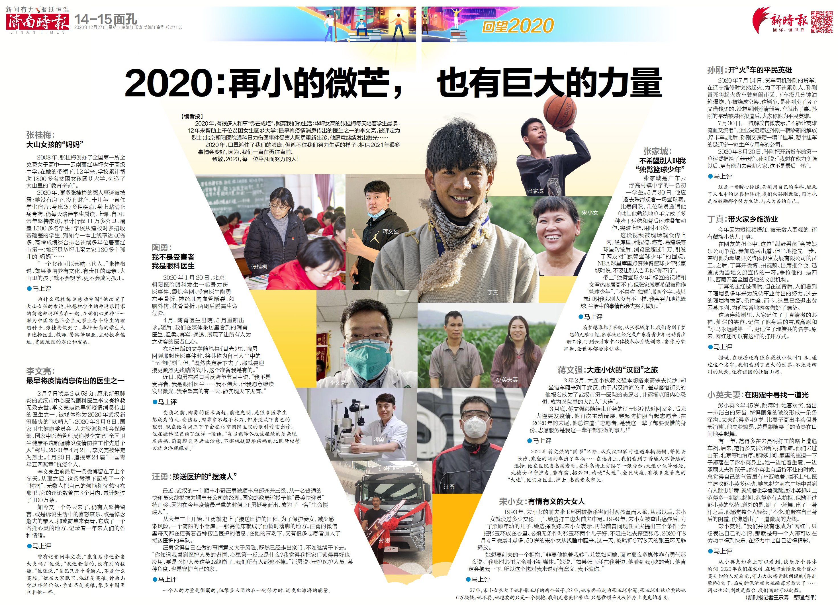2020年,有很多人和事“微芒成炬”,照亮我们的生活:华坪女高的张桂梅每天陪着学生晨读,12年来帮助上千位贫困女生圆梦大学;最早将疫情消息传出的医生之一的李文亮,被评定为烈士;北京朝阳医院眼科暴力伤医事件受害人陶勇重新出诊,他愿意继续发出微光……