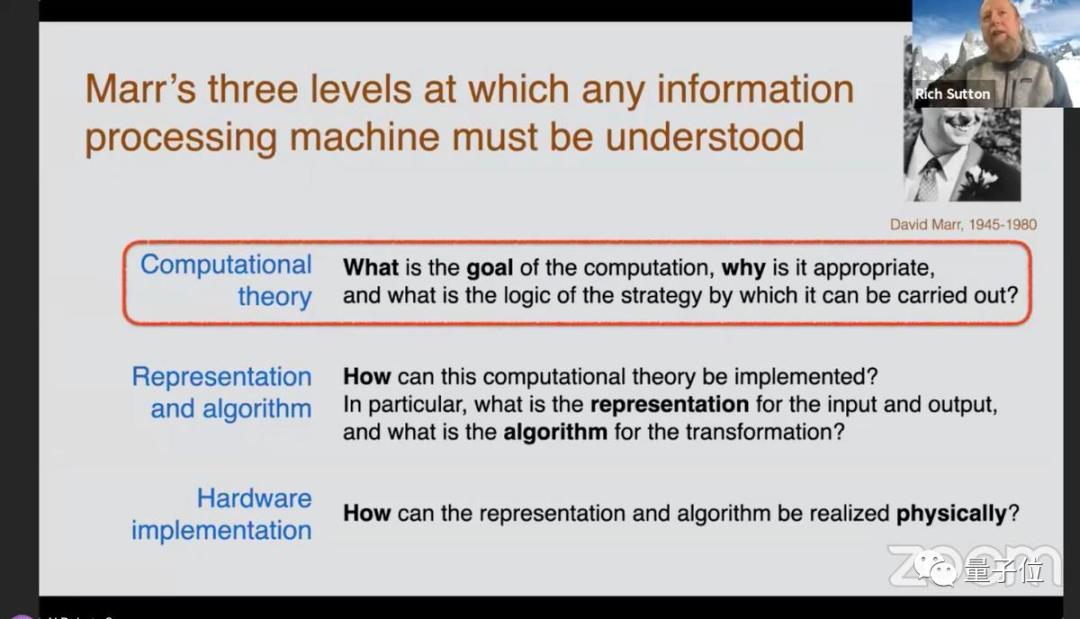 Sutton回忆起神经科学家David Marr。他描述了Marr关于所需的三个处理层次的概念:计算理论、表示和算法、硬件实现。Sutton说,Marr对计算理论特别感兴趣,但今天人工智能中“几乎没有计算理论”。Sutton说,像梯度下降这样的东西是“How”,而不是计算理论需要的“What”。