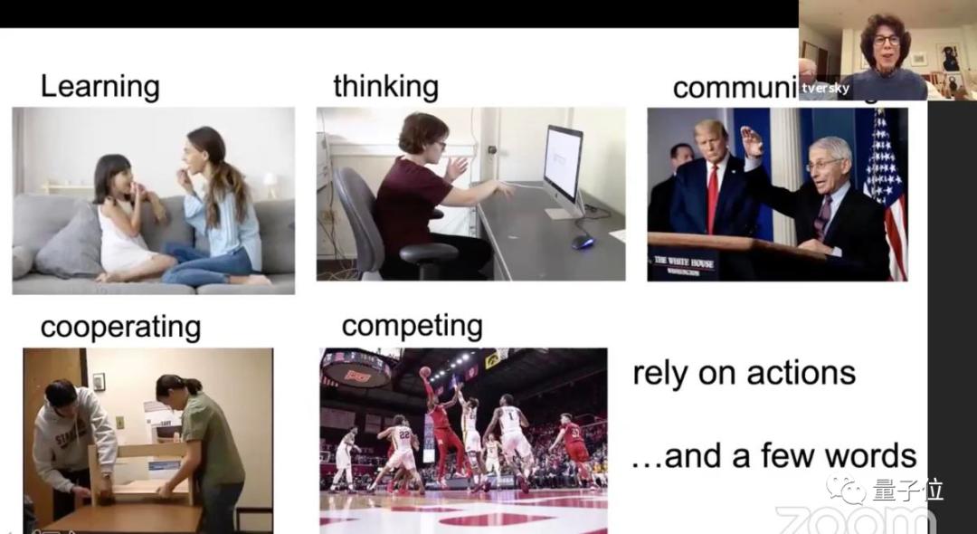 在PPT上,Tversky谈到了人们如何做手势、做空间运动,这可以影响人们思考。