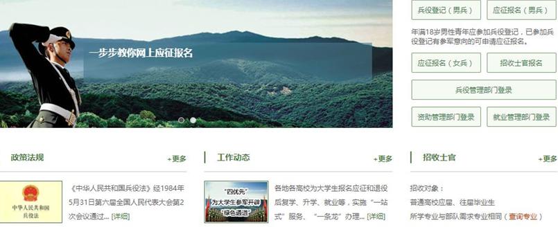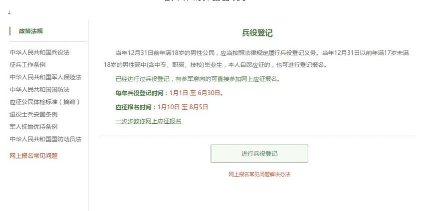 在这个页面中,会告知报名时间以及参军的政策说明,建议看后,点击 进行兵役登记 ,迈出你军旅生涯的第一步吧!