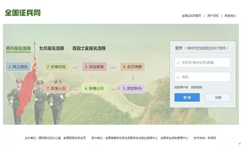 四、登记流程 (一)网上注册信息。登录“全国征兵网”、点击“兵役登记”选项,进行实名注册并真实、完整填写个人基本信息。(二)打印表格。信息填写完整后,打印《男性公民兵役登记表》。(三)现场确认。青年本人持打印的《男性公民兵役登记表》,携带身份证(户口簿)、毕业证(学历证明)、2张1寸免冠红底证件照到兵役登记站现场确认。(四)初检初考得出结论。乡镇(街道)兵役登记站、高校征兵工作站对参加兵役登记的适龄男性公民进行初检初考,并依法作出应征、缓征、免征和不得征集的结论,填写《兵役登记证》,并报县(市、区)兵役机关审核。(五)发放《兵役登记证》。乡镇(街道)兵役登记站、高校征兵工作站将县(市、区)兵役机关审核盖章的《兵役登记证》发放给青年。《兵役登记证》作为有关部门查验适龄男性公民履行兵役义务的依据。