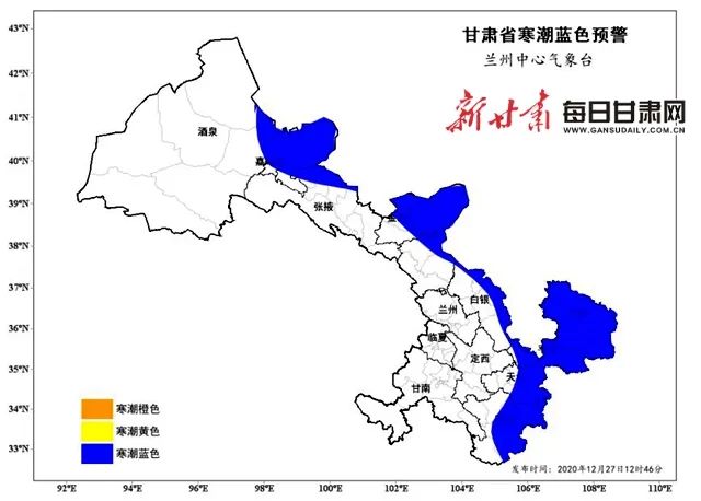 12月27日12时53分,兰州中心气象台发布甘肃省寒潮蓝色预警:受强冷空气影响,预计28日至30日平凉、庆阳、陇南三市部分地方及酒泉、武威、白银、天水等市局部地方气温下降8℃—10℃以上,将出现寒潮。请注意防范!