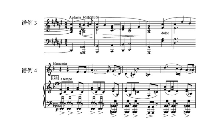 傅:柏辽兹真是伟大的作曲家!他的音乐可有真正的大格局,旋律张弛收放间尽是天宽地阔,心灵所至得以穷究宇宙永恒的奥义。就拿歌德《浮士德》的玛格丽特而言,李斯特《b小调钢琴奏鸣曲》中的玛格丽特形象已经极为动人(谱例3),但柏辽兹在《浮士德的天谴》(La damnation de Faust,Op.24)中玛格丽特唱的浪漫曲《热切的爱之火焰》(D’amour l’ardente flamme,谱例4),境界却更为不凡。这就像王国维在《人间词话》中论宋徽宗与李后主。宋徽宗能够自道生世之戚已属不易,但李后主则有担荷全体人类罪恶之意,其境界高下自然不同。我不是说李斯特不好。无论就“音乐家”或是“人”,李斯特都足称伟大;然而就艺术境界而言,柏辽兹不仅有超越时代的不凡识见,更有一些旁人难及的天赋感应,能和天地古今沟通。这就是言语无法形容的高超境界了。